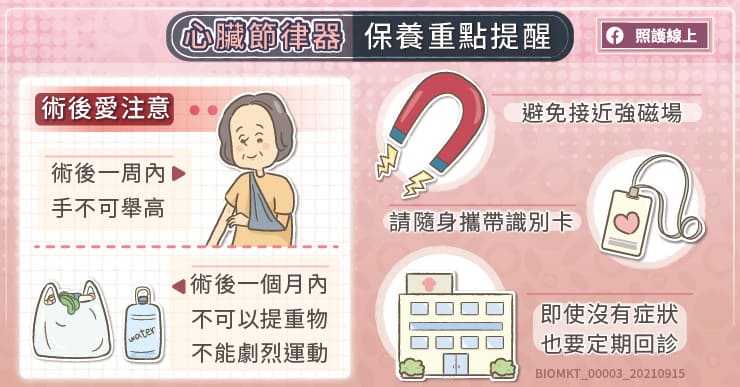 因為心臟節律器是精密的電子裝置,請避免撞擊、勿任意拍打,也要避開強磁場,以免遭到干擾。患者要隨身攜到心臟節律器之識別卡,就醫或通過安檢時請主動告知。