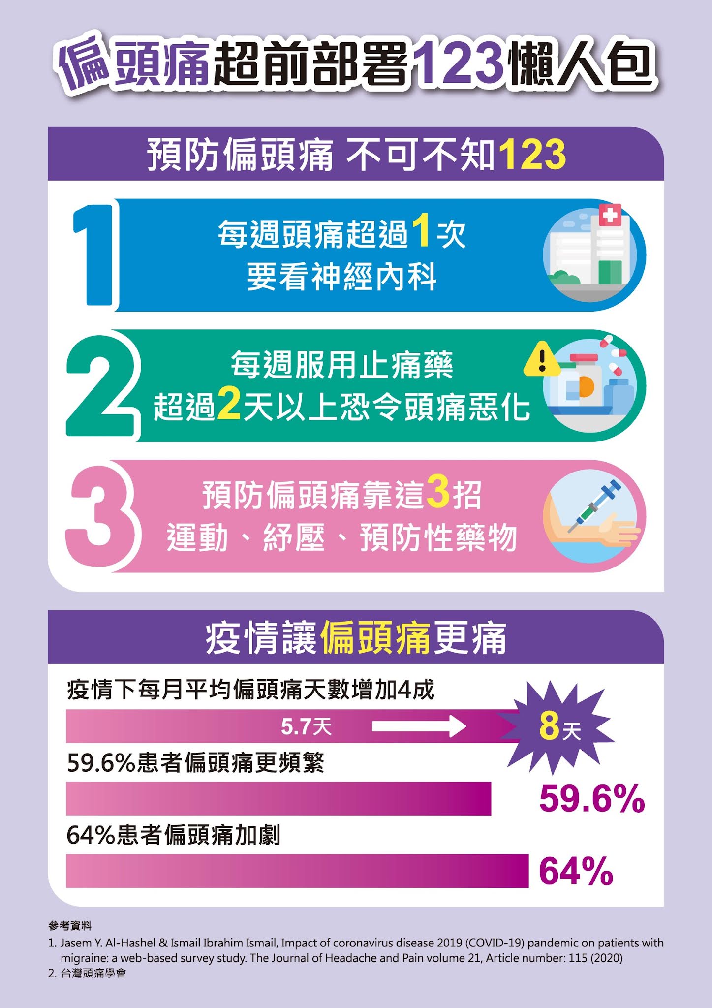 台灣頭痛學會理事暨新光醫院神經科劉子洋醫師說,偏頭痛是可以積極預防與治療的疾病。為了幫助國人正確認識偏頭痛,學會發布「偏頭痛超前部署123懶人包」:每週頭痛超過「1」次要看神經內科、止痛藥每週吃超過「2」天恐讓頭痛惡化、預防偏頭痛靠這「3」招:運動、紓壓、預防性藥物。期望藉由簡單易記口訣,讓民眾一眼秒懂偏頭痛必知「超前部署」守則!