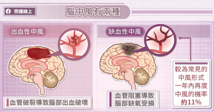 腦中風分為出血性及缺血性兩類型。出血性腦中風起因於腦血管破裂導致出血,造成腦組織受損;缺血性腦中風則因腦部血管阻塞,導致腦組織缺血壞死。其中,缺血性腦中風較常見,大概佔了7至8成。〔1〕