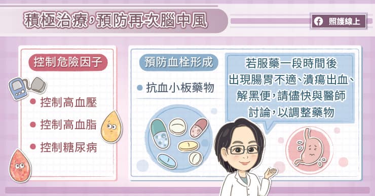 有些中風病患則是因藥物的副作用而停藥,例如腸胃不適、胃潰瘍出血、解黑便〔5〕。劉虹余醫師提醒,「若出現相關副作用,一定要在回診時主動向醫師提出並討論,以利醫師調整適合的用藥。」