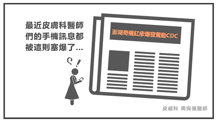 最近皮膚科醫師們的手機訊息都被這則「澎湖奇癢紅疹爆發驚動CDC」、「皮膚科醫師跨海緝凶」的新聞塞爆了。原來是澎湖連日來許多民眾發生皮膚出紅疹發癢狀況,造成衛生所和皮膚科診所大排長龍,讓大家不禁懷疑,到底是發生了什麼事情呢?