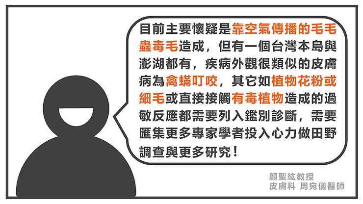 目前主要懷疑是靠空氣傳播的毛毛蟲毒毛造成,但有一個台灣本島與澎湖都有,疾病外觀很類似的皮膚病為禽蟎叮咬,其它如植物花粉或細毛或直接接觸有毒植物造成的過敏反應都需要列入鑑別診斷,需要匯集更多專家學者投入心力做田野調查與更多研究!