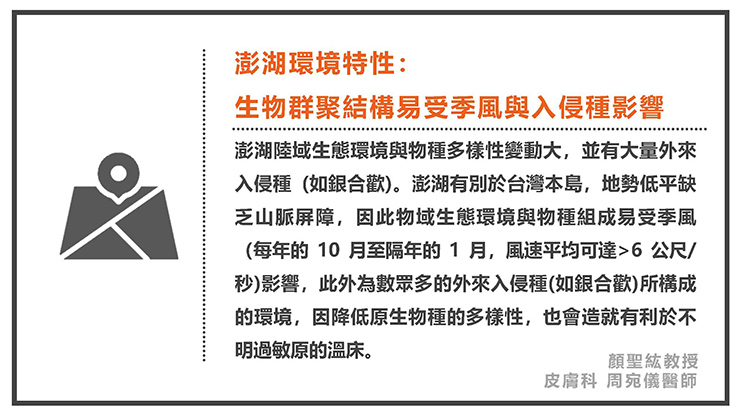 澎湖陸域生態環境與物種多樣性變動大,並有大量外來入侵種 (如銀合歡)。澎湖有別於台灣本島,地勢低平缺乏山脈屏障,因此物域生態環境與物種組成易受季風(每年的 10 月至隔年的 1 月,風速平均可達>6 公尺/秒)影響,此外為數眾多的外來入侵種(如銀合歡)所構成的環境,因降低原生物種的多樣性,也會造就有利於不明過敏原的溫床。