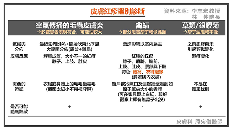 在皮膚紅疹鑑別診斷上,因為有澎湖大範圍區域(馬公/許多離島)的分佈,目前以空氣傳播的毛蟲皮膚炎較符合多數民眾的表現,可能性較大。但也有部分病人只有小範圍輕微的紅疹,並且有在暴露部位出現三個連一串的表現,比較偏向蚊蟲叮咬或是禽蟎的表現。而若是草類或銀膠菊產生的過敏形態一般比較偏濕疹的變化,與這次多數民眾身上疹子並不相同。