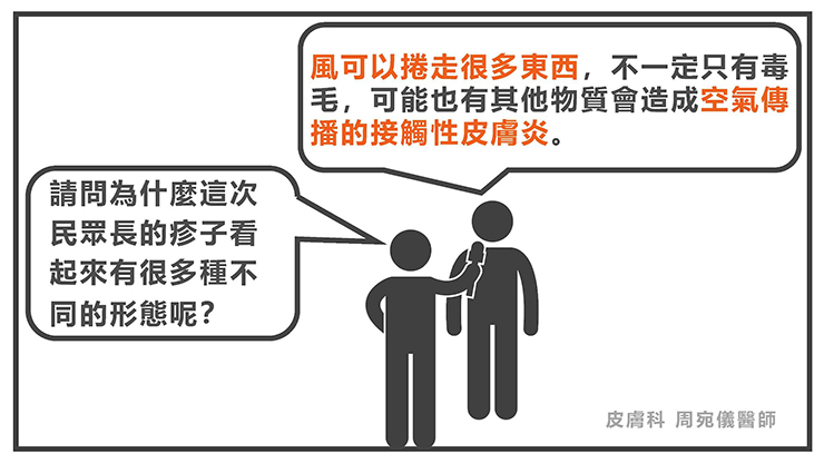 風可以捲走很多東西,不一定只有毒毛,可能也有其他物質會造成空氣傳播的接觸性皮膚炎,產生不同形態的皮膚疹子。也因此需要做更多的調查才能確定整起事件的前因後果。