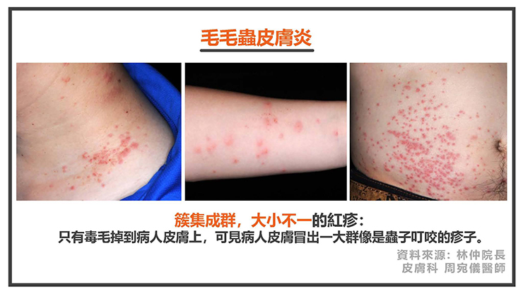 毛毛蟲皮膚炎會產生簇集成群,大小不一的紅疹:只有毒毛掉到病人皮膚上,可見病人皮膚冒出一大群像是蟲子叮咬的疹子。