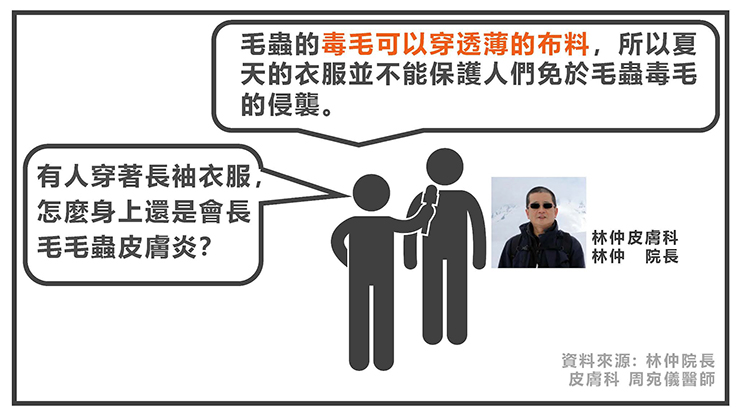 「我穿著衣服,怎麼身上會長出毛蟲皮膚炎?」毛蟲皮膚炎常見於人體脖子、四肢等衣服沒有蓋到的部位,但疹子也可能出現於衣服覆蓋的地方,難道衣服不能保護皮膚嗎?這是很多病人心中的疑點。此問題的解答為,毛蟲的毒毛可以穿透薄的布料,所以夏天的衣服並不能保護人們免於毛蟲毒毛的侵襲。