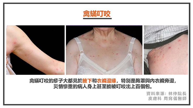 禽蟎叮咬的疹子大都見於腋下和衣褲邊緣,特別是胸罩與內衣褲旁邊,災情慘重的病人身上甚至能被叮咬出上百個包。