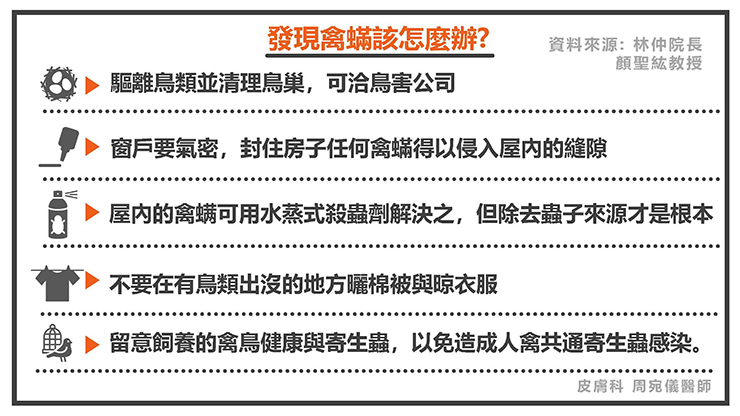3. 屋內的禽蟎可用水蒸式殺蟲劑解決之,但除去蟲子來源才是根本。如果效果不佳可以考慮找專業的除蟲公司協助。