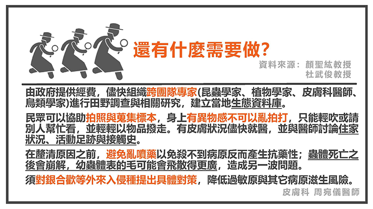 2. 民眾可以協助拍照錄影與蒐集標本,標本可以寄給科博館詹美鈴博士協助鑑定,身上有異物感不可以亂拍打,只能輕吹或請別人幫忙看,並輕輕以物品撥走。有皮膚狀況儘快就醫,並與醫師討論住家狀況、活動足跡與接觸史。