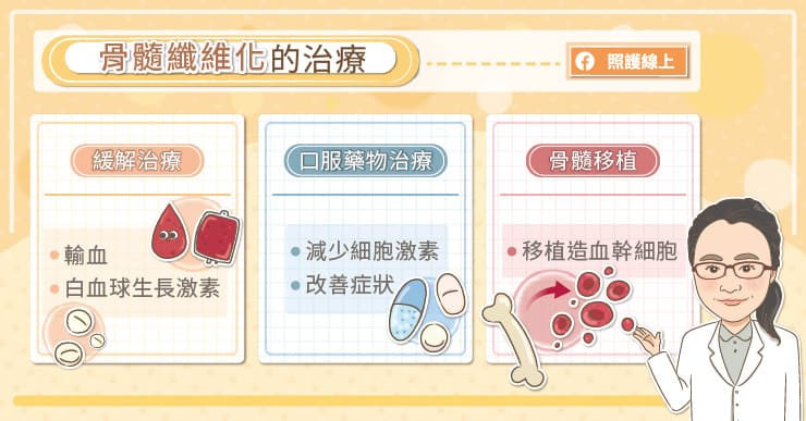 骨髓纖維化的根本治療,需要做骨髓移植,但對年紀較大的患者而言,骨髓移植的風險較高。李思錦醫師解釋,無法接受骨髓移植的患者會採取緩解治療,如患者的白血球功能較差、容易感染,可能會給予白血球生長激素;若是紅血球不夠,可以輸血或給予促進紅血球生成的藥物;若是血小板不足,可輸血小板,或使用促進血小板增生的藥物。
