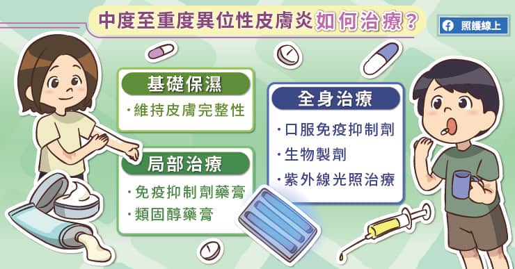 此外,針對異位性皮膚炎的病灶,還可以使用局部治療,王志堯醫師解釋,例如免疫抑制劑藥膏、類固醇藥膏,若有感染的狀況,也需要使用抗生素治療。