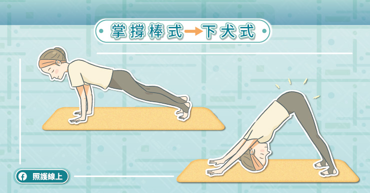 這是個同時可以鍛鍊核心肌力,又讓肌肉保有彈性與肌筋膜延展的動作。先做掌撐棒式,接著手與腳尖著地的地方不變不動,把髖部臀部往後往上推到頂點,腳掌往地墊彩身體呈現一個倒V型,就是下犬式。