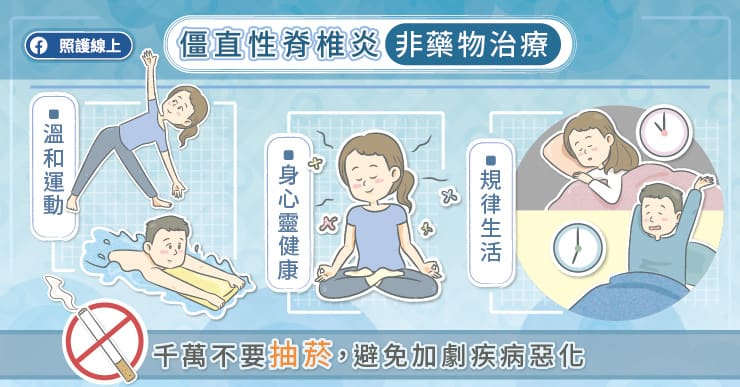 魏正宗醫師說明,目前針對僵直性脊椎炎的治療,可分為非藥物治療及藥物治療:非藥物治療包括運動及生活改善,運動建議以有氧運動、溫和伸展操為主,如游泳、伸展運動、瑜伽體操或太極拳,應避免激烈運動。生活改善方面除了要維持作息規律、早睡早起等習慣外,保持身心愉悅也對疾病有很大的幫助,另外僵直性脊椎炎患者千萬不要抽菸,避免加劇疾病惡化。