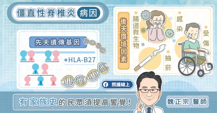 中山醫學大學附設醫院副院長暨過敏免疫風濕科魏正宗醫師說明,僵直性脊椎炎好發於年輕族群,男女比為3:1,病因多爲先天遺傳基因加上後天環境因素影響,僵直性脊椎炎與HLA-B27(人類白血球抗原B27)有強烈的關聯性,根據研究顯示,有95%僵直性脊椎炎的患者都帶有HLA-B27基因,發病率約莫10~20%;而後天環境因素包括受傷及感染(如細菌、病毒等),誘發異常的免疫發炎反應發生。