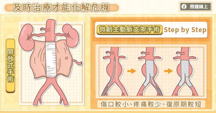 腹主動脈瘤的治療方式分為傳統的開腹手術,以及微創主動脈支架介入手術方副吉主任說,過去傳統開腹手術是將病變的腹主動脈切除,再使用人工血管修補。傳統開腹手術的術後復發率較低,但由於傷口較大、必需全身麻醉、手術時間與恢復期較長。接受這樣的大手術,病人術後需要住進加護病房,等狀況穩定之後才轉到普通病房。