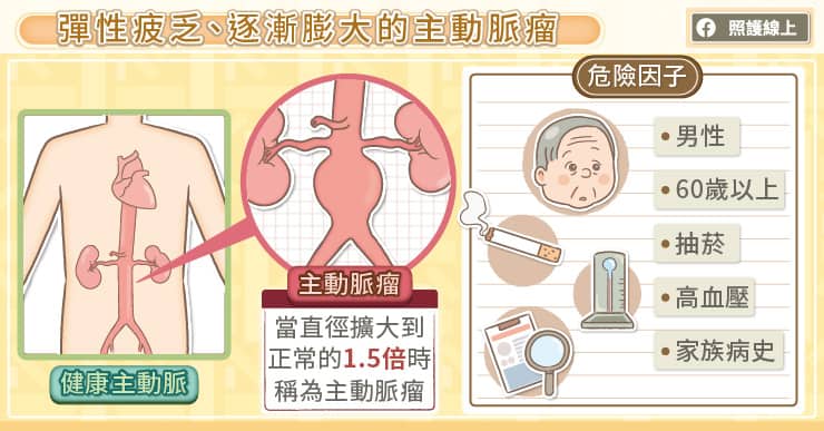 主動脈是人體最大的血管,負責將血液輸送到全身,長時間承受血流的衝擊,方副吉主任解釋,主動脈由三層結締組織組成,當主動脈管壁中的肌肉層退化造成彈性疲乏時,可能像氣球一樣逐漸膨大,當腹主動脈直徑擴大到正常主動脈的1.5倍時,就稱為腹主動脈瘤。若膨大的部分位在胸主動脈,則稱為胸主動脈瘤。