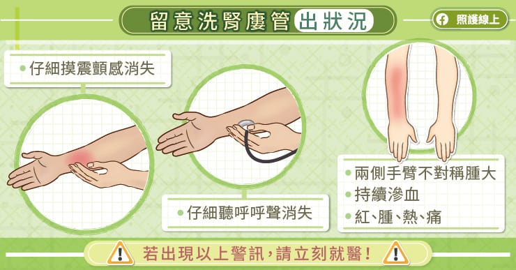 用手觸摸時,震顫感消失:正常動靜脈廔管的血流較強,輕輕觸摸時,會有震顫感,當震顫感消失,代表血流受阻。