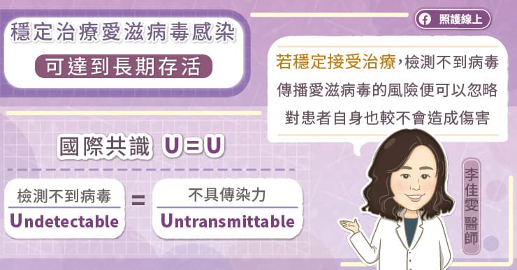 目前對於愛滋治療的國際共識為「U=U」,也就是「檢測不到病毒Undetectable」即「不具傳染力Untransmittable」。愛滋病毒感染者只要能夠規則接受治療,將血液中的病毒量控制在測不到的狀態(低於200 copies/ml)持續達六個月以上,其傳播病毒的風險便可以忽略,對患者自身也較不會造成傷害。