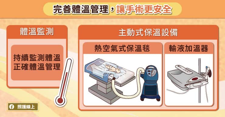 「術中正確體溫監測亦非常重要,」劉治民醫師強調,「除了避免體溫過低,也需要留意體溫過高,持續監測體溫,並適時調整主動式保溫設備,才能達到完善的體溫管理,讓手術過程更安全。」