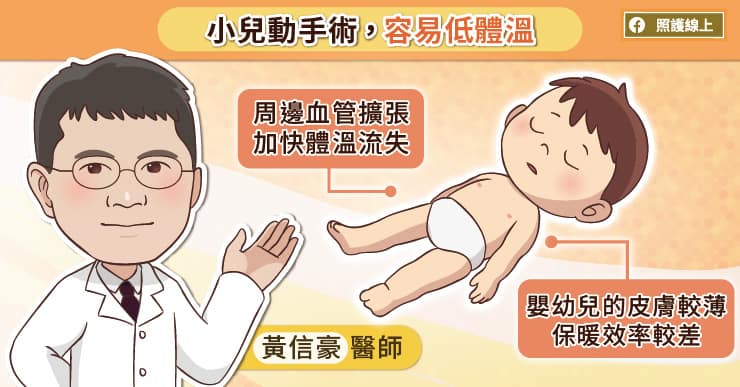 小朋友的體重較輕,產熱能力較弱,在接受麻醉動手術的時候,很容易出現手術低體溫。黃信豪醫師指出,尤其是手術時間較長的手術,例如腹腔腫瘤、胸腔腫瘤、骨頭矯正等。