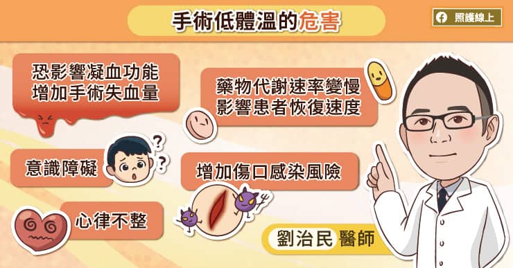 人體的各項生理機能都需要在適當的體溫下,才能正常運作,黃信豪醫師說,手術中體溫過低會帶來多種不良影響,例如影響凝血功能,增加術中出血量、影響藥物代謝,術後較難甦醒、影響中樞神經系統功能,導致意識障礙、影響免疫功能,增加傷口感染的機率,即使手術順利完成了,手術低體溫也會影響術後的恢復。