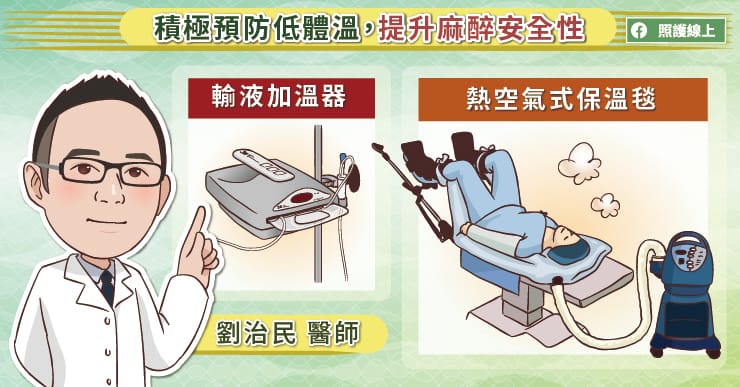 核心體溫過低時,單靠蓋棉被通常無濟於事,劉治民醫師解釋,由於麻醉後體溫流失的速度較快,且身體無法藉由顫抖產熱,所以必須利用主動式保溫設備來幫助患者維持體溫。常見的主動式保溫設備包括烤燈、熱水墊、輸液加溫器、熱空氣式保溫毯等。