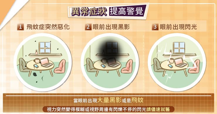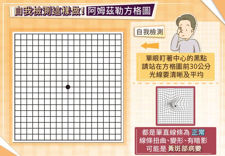 (八) 用阿姆茲勒方格圖(Amsler Grid)自我檢測:將檢測表格放在眼前30公分,盯著黑點看,先遮住一眼測試,再換眼測試。如果看到直線條,且每個地方都沒有缺損,則表示正常。若線條為波浪形、曲線,或線條缺損,可能是黃斑部病變的徵兆,請儘速就醫。