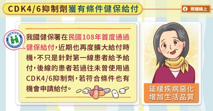 口服CDK4/6抑制劑標靶藥物目前已被國際治療準則,列為管腔型乳癌轉移或復發後的第一線標準治療,因此台灣健保署於民國108年首度通過該藥物健保給付,在符合條件的情況下給付CDK4/6抑制劑於管腔型乳癌的治療。黃俊升教授說,於試驗結果來看,管腔型乳癌的患者在轉移後第一線就使用CDK4/6抑制劑治療,能有效提升患者存活率,此外台灣健保署於近期也再度擴大給付條件,不只是針對第一線患者給予給付,後線的患者若過往未曾使用過CDK4/6抑制劑,若符合條件也有機會申請給付,癌友不必因為經濟考量而犧牲治療。