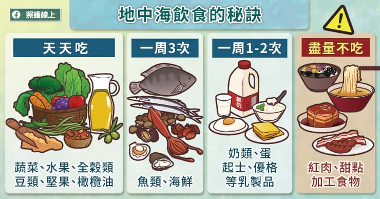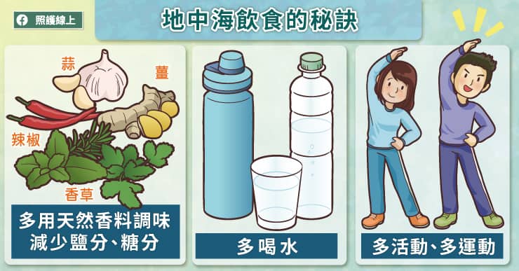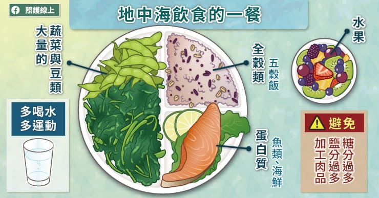 最後做個總結,地中海飲食的概念,包含了多吃蔬菜、水果、全穀類,適量攝取海鮮,少吃紅肉、甜食、加工食物,多運動多喝水。掌握這些簡單的概念後,就是在生活中活化運用,對體重控制、心臟健康、腦袋清楚、預防糖尿病等都有幫忙。想要維持健康,重點絕對不是每天要吞一堆藥丸或補充保健食品,而是從日常生活中做出健康的好選擇。延伸閱讀