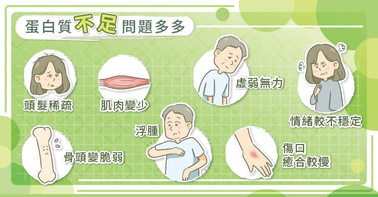 我們需要攝取足夠的蛋白質,身體才有辦法生長發育、修復組織。當體內蛋白質不足時,可能造成很多問題,例如虛弱無力、肌肉變少、頭髮稀疏、傷口癒合較慢、保護力降低、情緒較不穩定等。