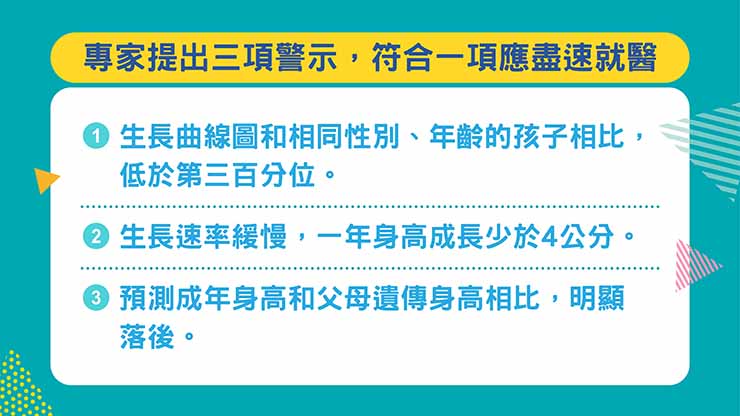 新竹馬偕紀念醫院小兒內分泌科主任林昭旭說明,以下三點若有對應符合其中一點,家長就該警覺帶孩子及早就醫查明原因。