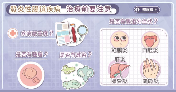 張崇信醫師說明,發炎性腸道疾病患者在接受治療前,需要接受一系列檢查,確認疾病範圍、嚴重度;確認是否有感染,例如巨細胞病毒、結核菌、細菌、厭氧菌等;確認是否有腫瘤,例如腸子的淋巴癌;並確認是否有腸道外症狀,例如眼睛、關節、皮膚、膽道、肝臟等。醫師會綜合各項資訊,選用合適的藥物組合。