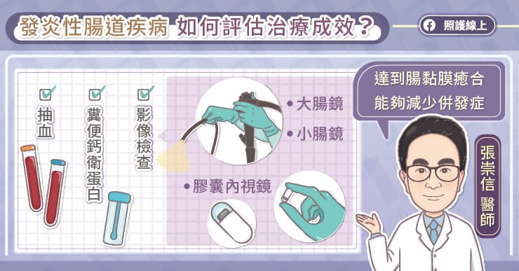 治療發炎性腸道疾病時,很多病友會誤以為只要肚子不痛、沒有拉肚子、能夠吃東西就夠了,但是在臨床症狀緩解後,患者的腸道其實還在發炎,張崇信醫師強調,因此需要持續追蹤,包括抽血檢驗發炎指數、檢驗糞便的鈣衛蛋白,也可以做小腸超音波、腹部核磁共振攝影、小腸鏡、大腸鏡、膠囊內視鏡等,利用各種工具來評估治療成效。