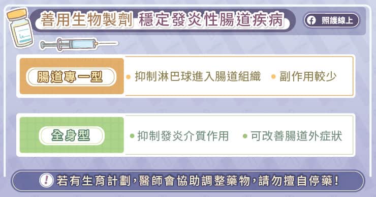 生物製劑大致可分成兩大類,腸道專一型與全身型。腸道專一型生物製劑可抑制淋巴球進入腸道組織,於腸道發揮抗發炎的效果,副作用較少;全身型生物製劑可抑制發炎介質作用,有助改善腸道外症狀。