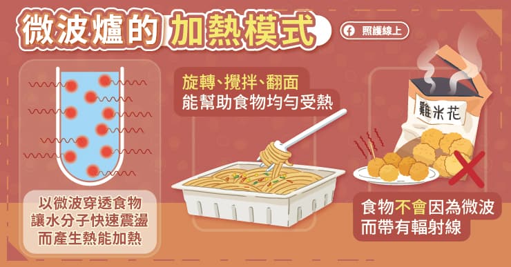 微波爐啟動後,會釋放微波讓食物裡面的水分子快速震盪、產生熱能,以很有效率的方式加熱。
