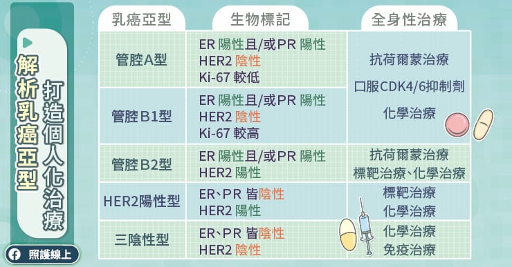 乳癌治療已進入個人化治療的時代,首先醫師會根據3個受體還有1個癌症生長指數來區分乳癌亞型,郭耀隆教授說,3個受體分別是雌激素受體ER、黃體激素受體PR、人類表皮生長因子受體HER2及癌症生長指數Ki-67,Ki-67數值越高就代表癌細胞生長的速度較快。乳癌亞型可分成管腔A型、管腔B1型、管腔B2型、HER2陽性型、三陰性型,這幾種亞型的預後和治療策略不太一樣。