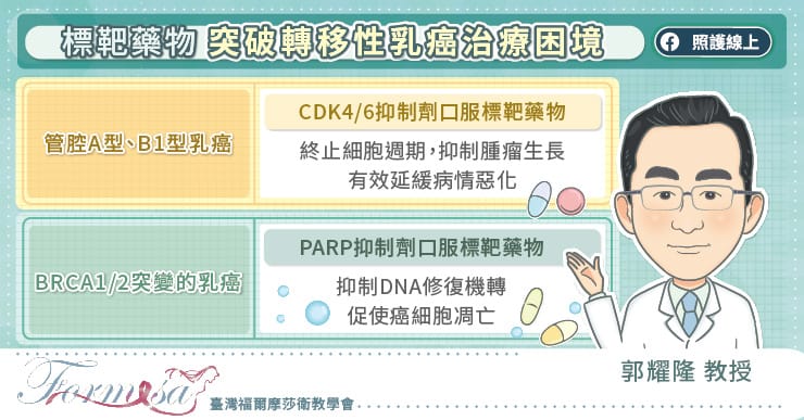 轉移性乳癌的治療以全身性治療為主,除了化學治療外,還能根據乳癌亞型選擇不同的藥物組合,提升治療成效。郭耀隆教授解釋,「管腔A型」和「管腔B1型」乳癌可以使用抗荷爾蒙治療,搭配口服CDK4/6抑制劑標靶藥物,口服CDK4/6抑制劑能夠抑制癌細胞的生長週期,讓腫瘤不再繼續增生。