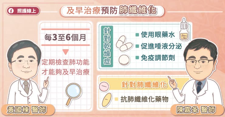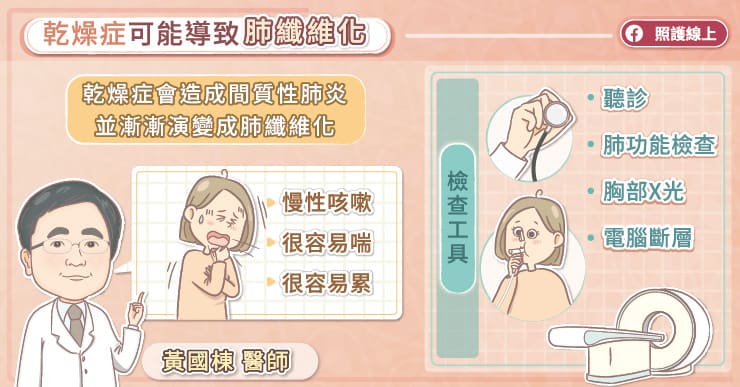 乾燥症會造成全身性發炎反應,可能導致肺纖維化,一定要好好控制,並定期追蹤肺功能,才能及早發現,及早治療。