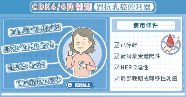 口服CDK4/6抑制劑標靶藥物能有效延緩疾病惡化,維持生活品質,且副作用較化學治療少,是對抗晚期乳癌的利器。