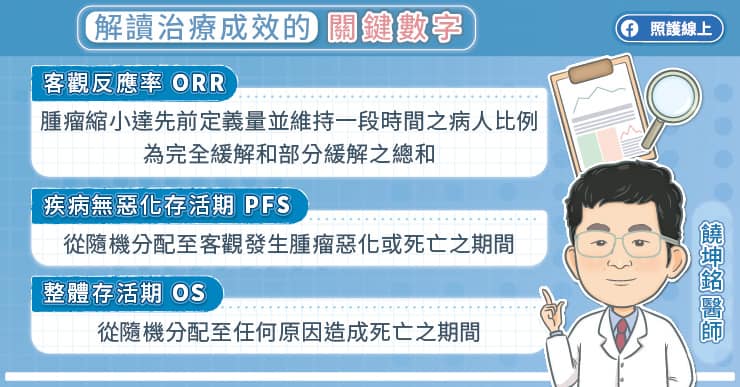 「客觀反應率ORR(Objective response rate)」是腫瘤縮小達先前定義量並維持一段時間之病人比例,為完全緩解及部分緩解之總和。饒坤銘醫師解釋,治療過程中會定期檢查,評估腫瘤的大小,最好的情況是通通不見,稱為完全反應;若腫瘤縮小,但沒有完全不見,稱為部分反應。把完全反應跟部分反應兩者相加,即客觀反應率ORR。簡單來講就是100個病人接受治療後,有幾個病人的腫瘤會縮小。