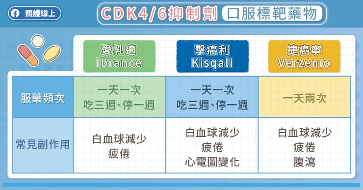 目前台灣有三款CDK4/6抑制劑口服標靶藥物,愛乳適Ibrance、擊癌利Kisqali、捷癌寧Verzenio,饒坤銘醫師說,這三款藥物的治療成效相近,差別在於使用方法與可能的副作用。