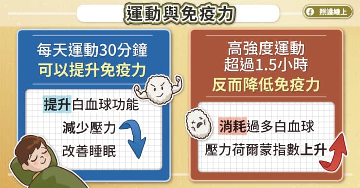 因此,運動還是要適量。若到了過度消耗消耗體力的程度,反而無法提升免疫力。畢竟,我們免疫系統最好要在沒有過大壓力的狀況下,才能運行得當。