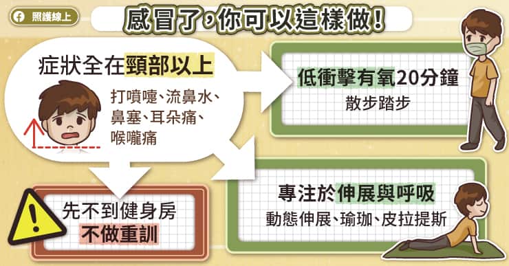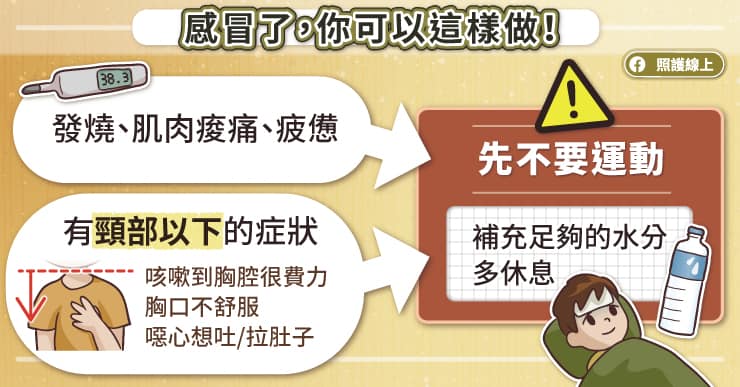 ● 如果有些頸部以下的症狀,像是咳嗽咳得嚴重,整個胸腔都很費力很不舒服,或是開始覺得胸口不舒服悶悶地,甚至變得比較喘,或有腸胃道的症狀,容易噁心想吐,或在拉肚子,就還是先不要運動吧!多多休息以及補充水分才是當務之急。等到休息夠了,症狀愈來愈不明顯,覺得自己好一點了,再開始從比較輕鬆的練習做起。