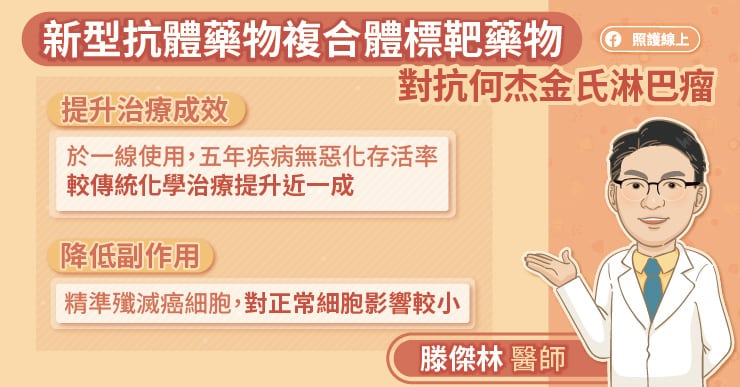 由於何杰金氏淋巴瘤年長患者的身體耐受度較低,常因無法承受標準劑量化療的副作用而容易導致治療中斷,新型藥物抗體複合體標靶藥物的出現,將有效改善過往治療的困境。根據研究指出,新型標靶治療提前於一線使用,相較於傳統化療的五年疾病無惡化存活比率提升近一成,治療成效顯著優異且穩定,並減輕以往化療可能會有的藥物毒性,提供患者有力的治療新選擇。此外,新型標靶藥物更於今年初擴大健保給付晚期何杰金氏淋巴瘤患者於一線使用,嘉惠許多患者獲得創新治療,減輕不少家庭的經濟負擔。