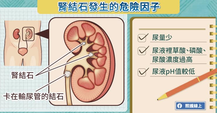在近幾年來,腎結石的發生率不斷攀高。當泌尿道產生結石的時候,通常以鈣質結晶為主,主要以「草酸鈣」為主,有些則是「磷酸鈣」,鈣質結石約占了七、八成。尿酸高也會產生尿酸結石,比例約是小於一成。於是,我們可以知道,當尿液裡面的草酸濃度過高、磷酸濃度過高、或尿酸濃度過高,都會比較容易形成結晶。