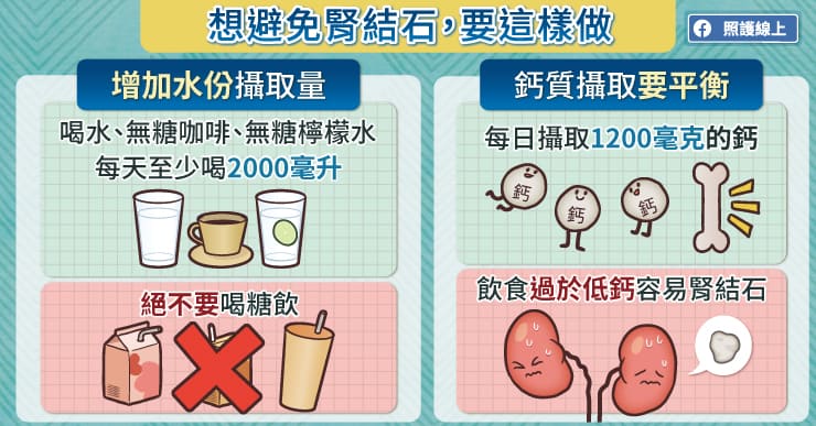 ● 鈣質攝取要平衡:每日鈣的攝取量1200毫克,過於低鈣反而容易腎結石