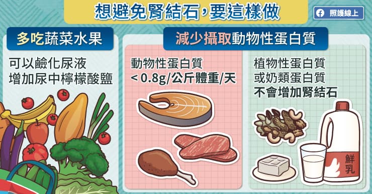 但假使你的蛋白質需求較高,是每天每公斤體重要超過0.8克到1克的狀況,又怕因此讓腎結石復發的話,可以考慮攝取植物性蛋白質或奶類蛋白質。目前研究認為,植物性來源的蛋白質不會影響腎結石的產生(不會增加或減少腎結石的發生率);如果是攝取從奶類來的蛋白質,則能減少腎結石的產生。