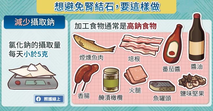 目前研究結果顯示,如果從高鹽飲食改為低鹽飲食後,腎結石的發生率就下降了。因此,如果你想避免腎結石,盡量每天不要攝取超過5克的食鹽。