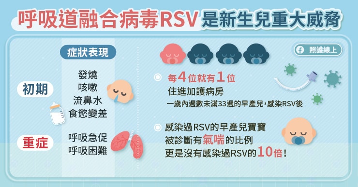 呼吸道融合病毒感染對早產兒是相當大的威脅,病程進展快,嚴重時需要使用正壓呼吸器,或插氣管內管住進加護病房。